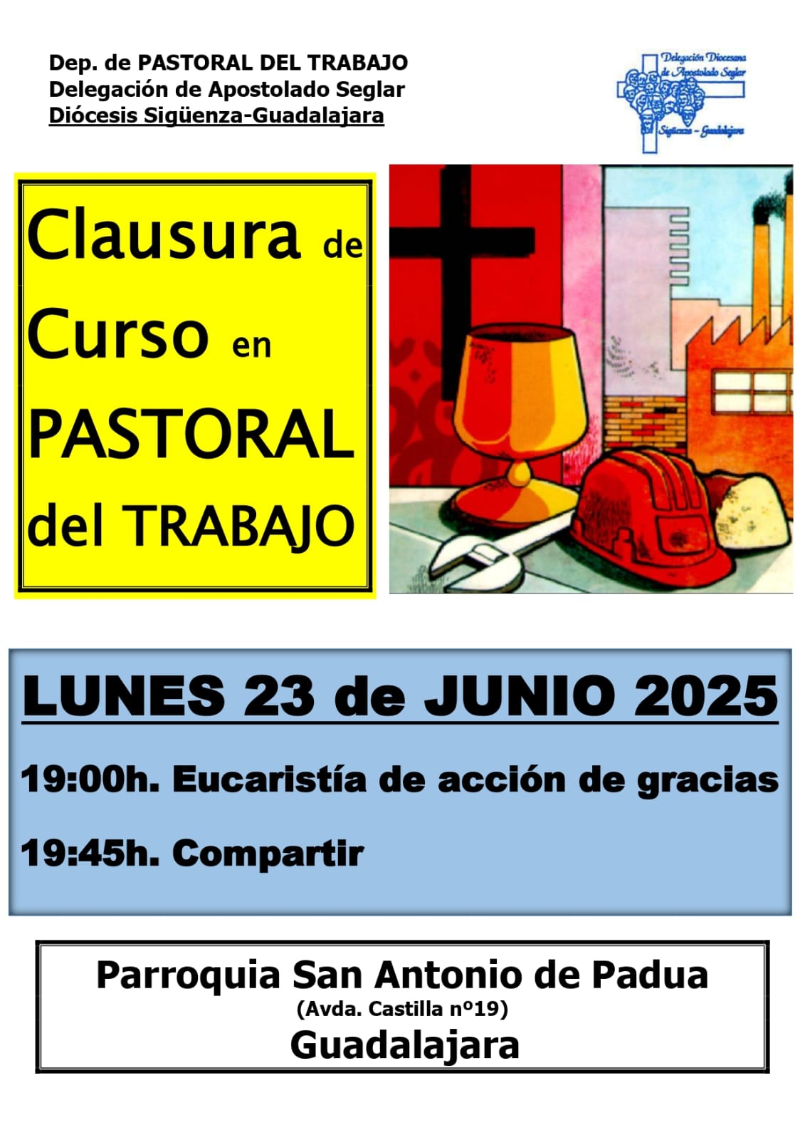 El sector de Pastoral del Trabajo, departamento de Apostolado Seglar que anima Marta Oter, anuncia los actos preparados para clausurar el actual curso pastoral. Al igual que otras actividades de su programa, serán en la parroquia de San Antono de Padua, de Guadalajara, el lunes 23 por la tarde. A las siete será la eucarístía de acción de gracias y a continuación, en los salones parroquiales, se ofrecerá un tiempo de compartir y concivencia.