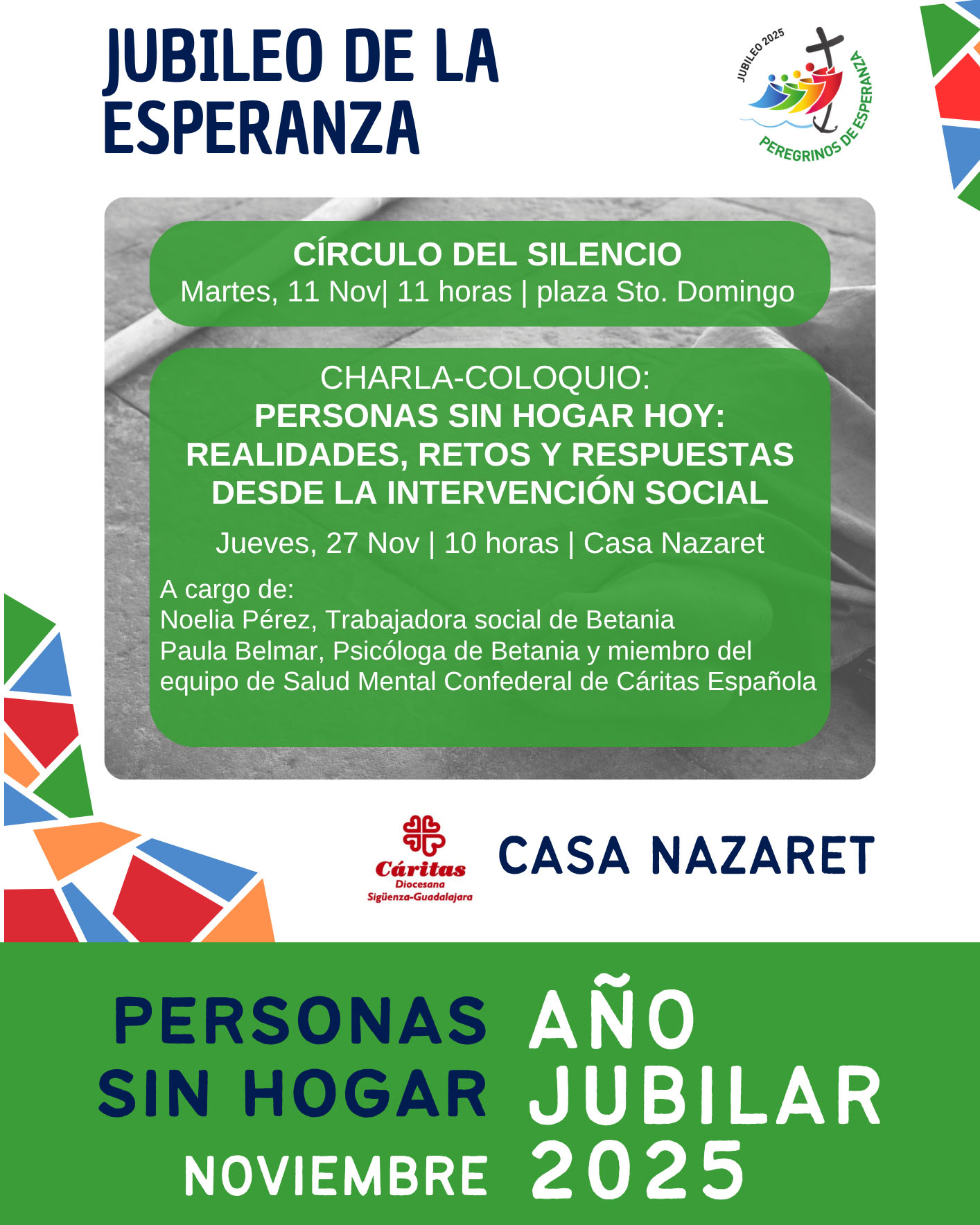 Dando continuidad al Día de las Personas sin Hogar, celebrado el último fin de semana de octubre, Cáritas Diocesana Sigüenza-Guadalajara en Casa Nazaret dedica el mes de noviembre a las personas sin hogar, protagonistas de señera presencia en el Centro Residencial Betania. Con tal motivo, el martes 11 por la mañana ha habido un Círculo de Silencio en la plaza de Santo Domingo de Guadalajara. Y se anuncia, para el jueves 27 a las 10 horas, una charla-coloquio bajo el título Personas sin hogar hoy: realidades, retos y respuestas desde la intervención, que impartirán Noelia Pérez, trabajadora social del Centro Residencial Betania, y Paula Belmar, psicóloga del Centro Residencial Betania y miembro del equipo de Salud Mental Confederal de Cáritas Española.