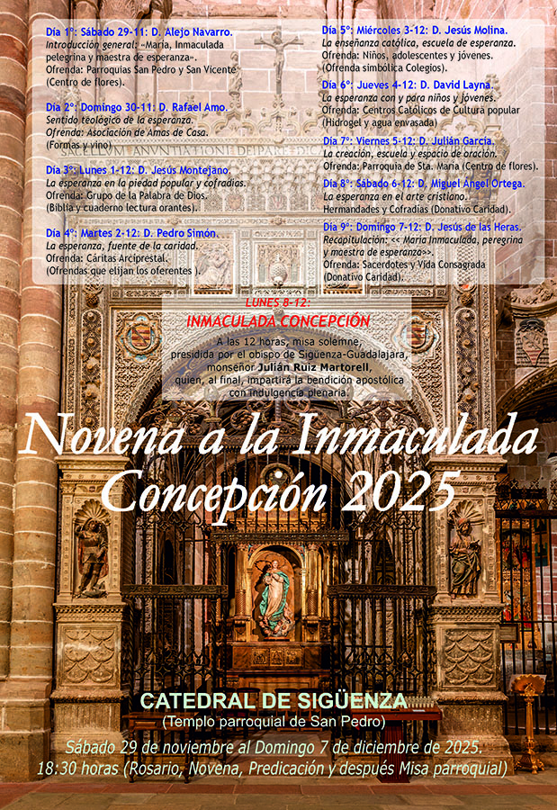 Bajo el lema María Inmaculada, peregrina y maestra de esperanza’ discurrirá el novenario en honor de la Inmaculada en la catedral de Sigüenza desde el sábado 29 de noviembre al domingo 7 de diciembre, todas las tardes en la iglesia de San Pedro, con comienzo a las 18:30 horas. Tras la novena habrá misa.