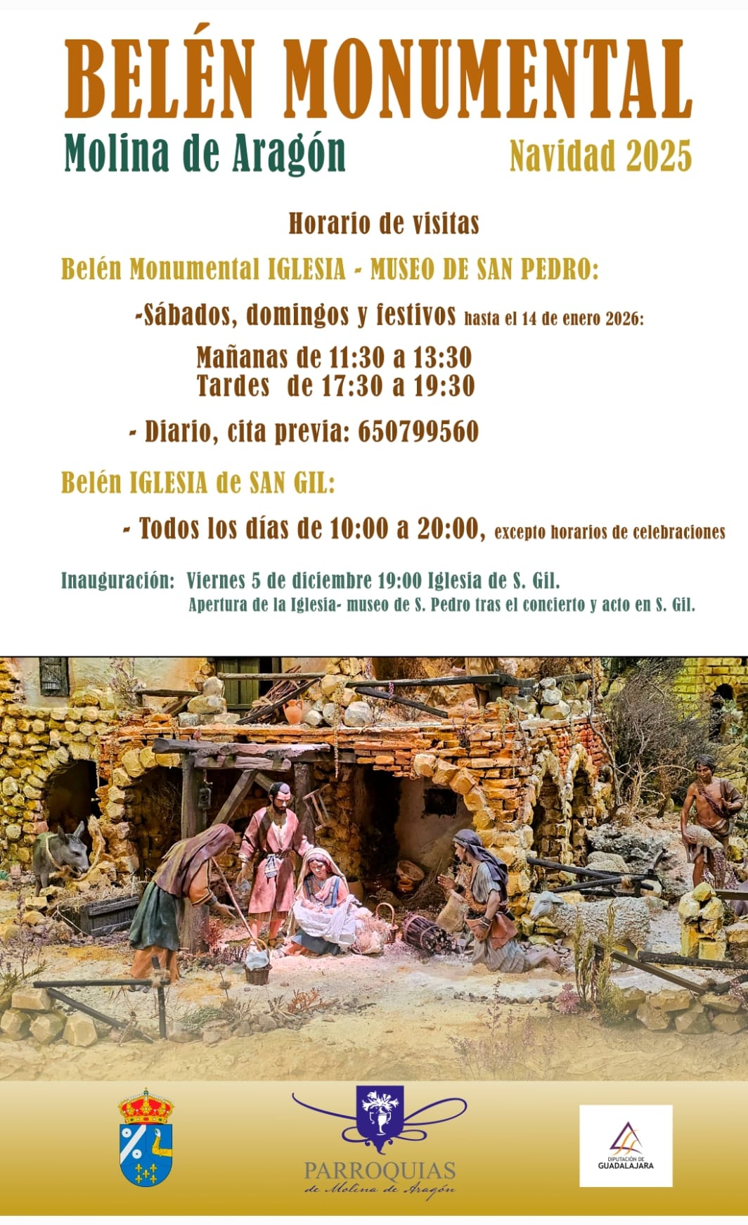 La Navidad de Molina de Aragón va a disfrutar de dos belenes parroquiales este año, que se inauguran a las 19:00 del viernes 5 de diciembre, como prólogo de la luminosa y excepcional Nochebuena molinesa que se celebra con misa de gallo en la media noche del 7 de diciembre. Este acto inicial se enriquecerá con un concierto en el templo de San Gil. Así, en la Navidad 2025 de Molina la dirección magistral del párroco belenista Rául Pérez facilita la contemplación de dos creaciones artísticas. En la iglesia-museo de San Pedro se ha montado el Belén Monumental, en un espacio de más de 70 metros cuadrados. Y en el templo de San Gil está el belén menor, pero siempre creación atractiva, denominado Belén de San Gil.