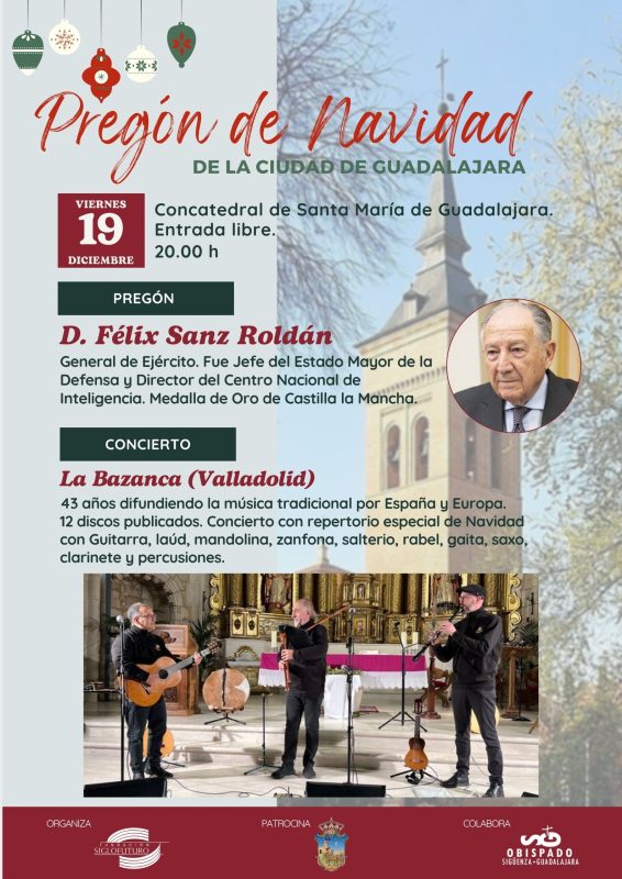 El tradicional pregón de Navidad de Guadalajara, que cumple ya 30 años, se celebrará el viernes 19 de diciembre a las 20 horas en la concatedral de Santa María, con el general Félix Sanz Roldán (Uclés, 1945, y que fue jefe del Estado Mayor de la Defensa, JEMAD, y director del Centro Nacional de Inteligencia) como pregonero y el concierto de La Bazanca, grupo de música tradicional de Castilla y León, con su repertorio especial de Navidad.