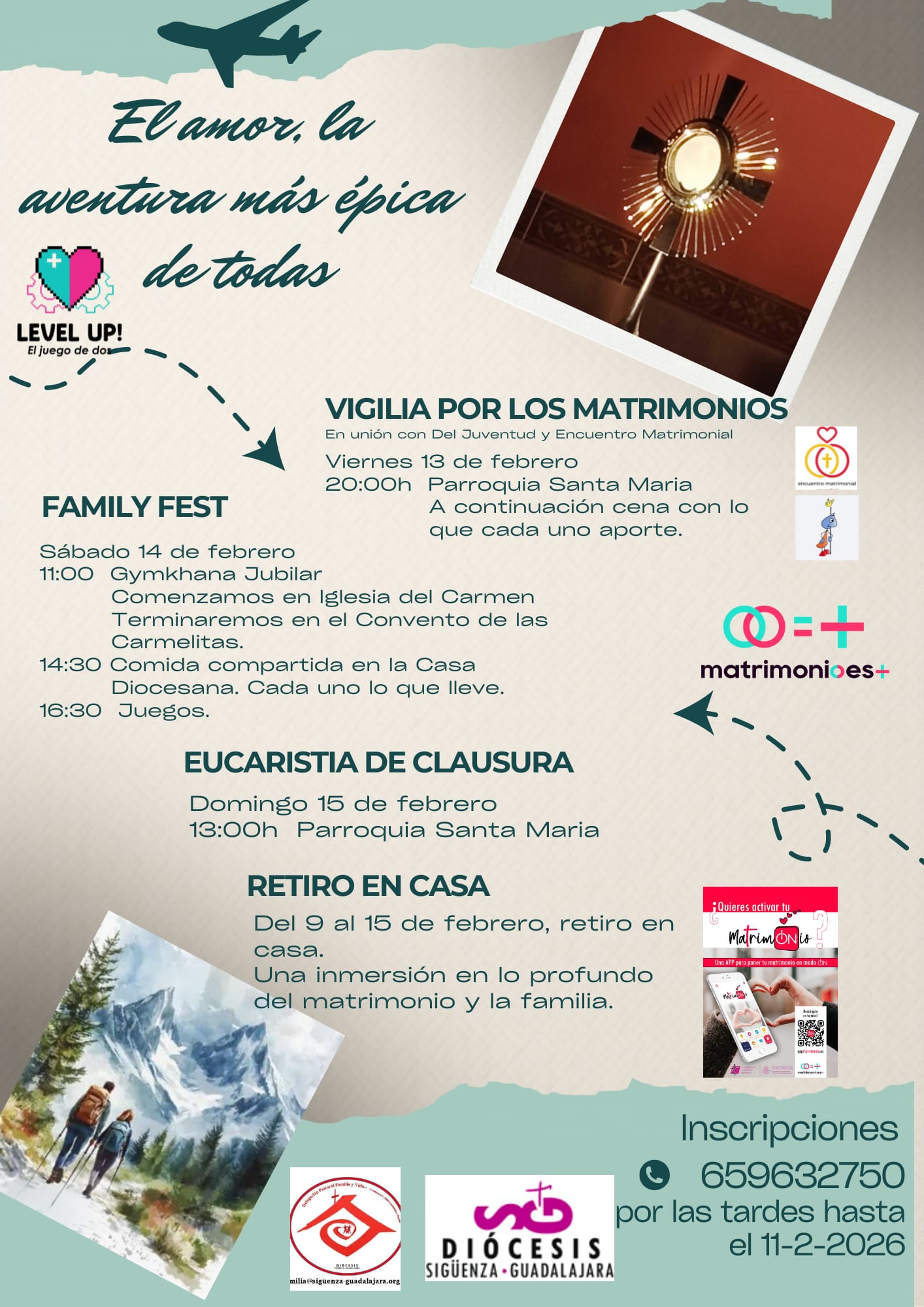 El lunes 9 de febrero es el lanzamiento del retiro familiar en casa a través de las redes sociales y a aplicación MatrimONio. Además, se han programado tres grandes actividades. La primera será viernes 13, con una vigilia de oración por los matrimonios y las vocaciones, con la colaboración de Encuentro Matrimonial y la Delegación de Vocaciones, a las 21 horas en Santa María de Guadalajara y una posterior cena compartida. El sábado 14, San Valentín, de 11 a 14 horas, habrá una yincana jubilar (Jubileo de las Concepcionistas Franciscanas) con visitas a la iglesia del Carmen y a la de las Carmelitas Descalzas de Guadalajara; a las 14:30 horas, almuerzo compartido en la Casa Diocesana de Guadalajara y, por la tarde, distintas actividades de fiesta, encuentro, convivencia, oración y diversión. Y, por fin, el domingo 15, habrá misa a las 13 horas, en Santa María de Guadalajara.