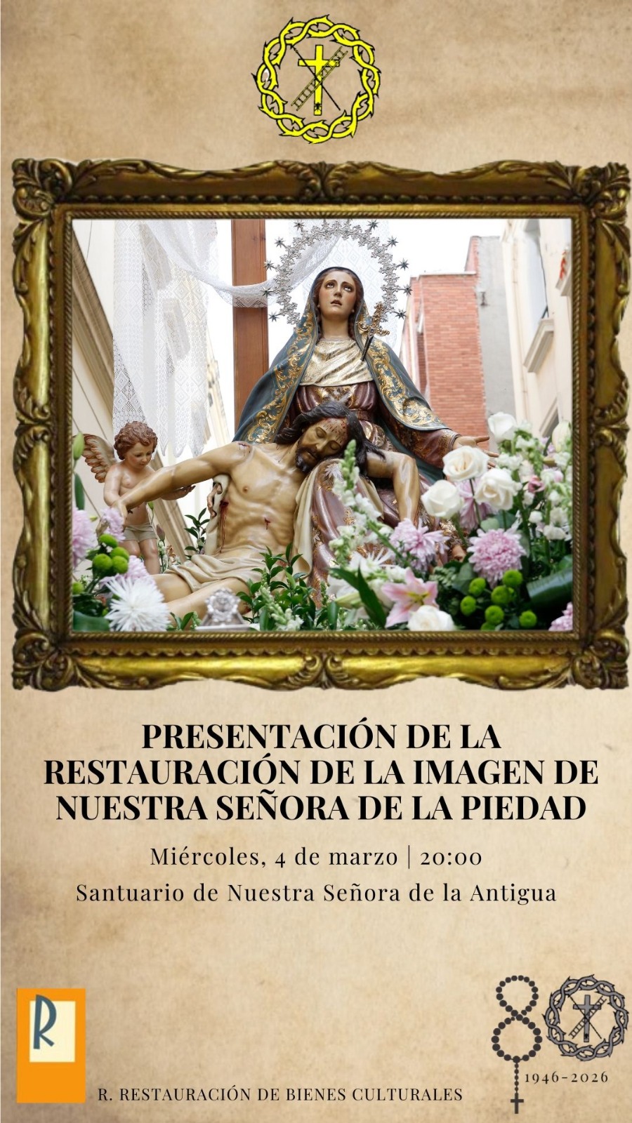 "El próximo miércoles, día 4 de marzo, a las 20.00 horas en el Santuario de la Virgen de la Antigua, la Cofradía de la Pasión del Señor, presentará en sociedad la restauración de la Virgen de la Piedad, y la consiguiente vuelta al culto de la misma.