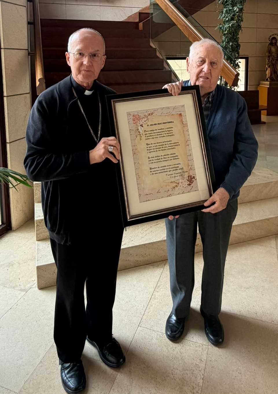 Don Julián Ruiz Martorell, el obispo diocesano, ha recibido un soneto del sacerdote y escritor Francisco Vaquerizo Moreno (1936) como regalo de cumpleaños en su 69 aniversario. El autor ha entregado personalmente al prelado un vistoso cuadro con la reproducción del poema. Bajo el título Don Julián Ruiz Martorell, la composición canta una docena de rasgos que el poeta descubre en el homenajeado. El soneto, de traza académica e inspiración clásica, se encuadra dentro de la amplia colección de obras homenaje que ha escrito el poeta.
