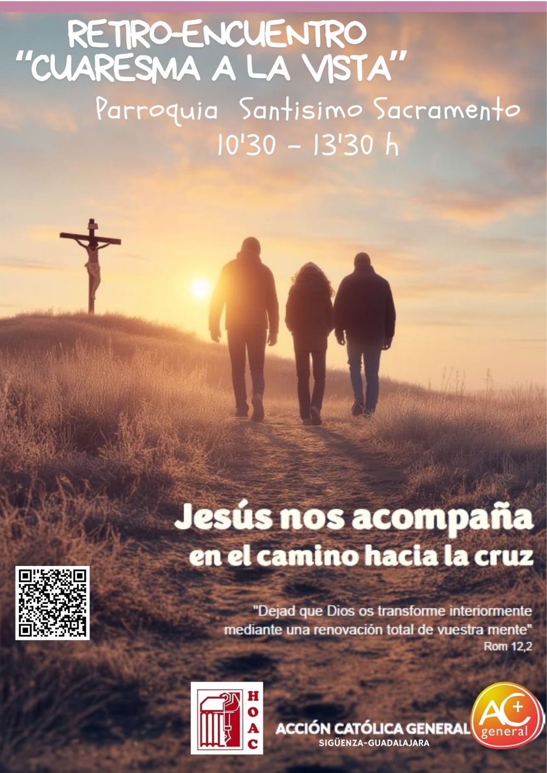 Los grupos de Acción Católica General (ACG) tienen el sábado 14 un encuentro y retiro bjo la denominación ‘Cuaresma a la vista’. La convocatoria se desarrollará en las dependencias parroquiales del Santísimo Sacramento (Guadalajara) entre las 10:30 y las 13:30 horas. El tema del retiro responde al título ‘Jesús nos acompaña en el camino hacia la cruz’. En esta ocasión también se asocia al encuentro de ACG el sector de Hermandad Obrera de Acción Católica (HOAC).