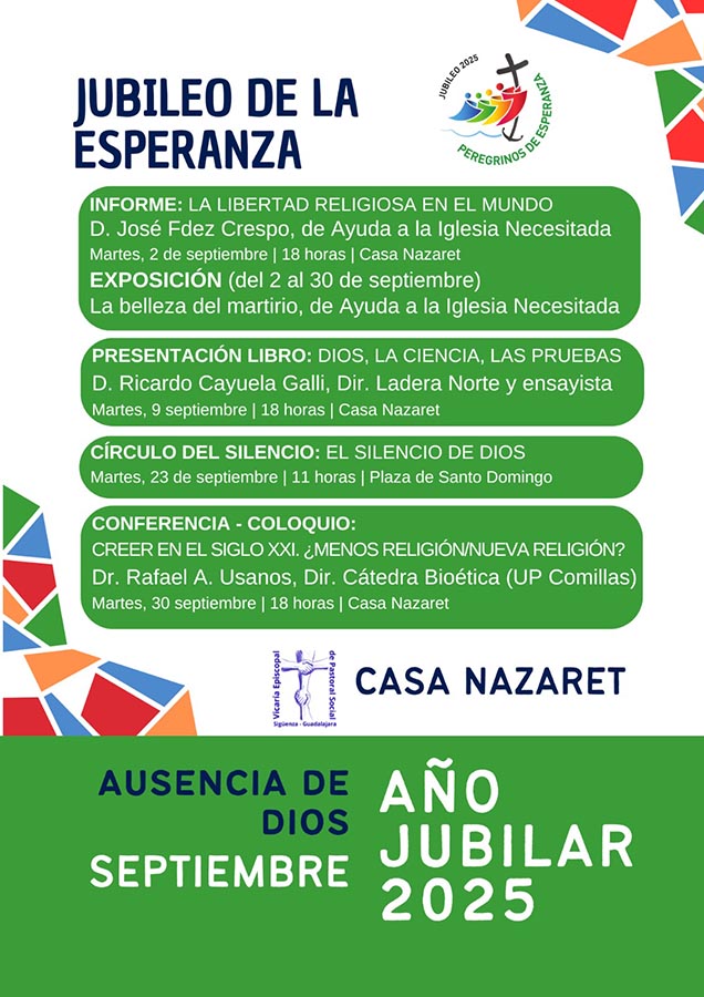 El sacerdote seguntino Rafael Amo Usanos cerrará los actos de septiembre organizados por Casa Nazaret dentro del programa que como lugar jubilar viene desarrollando durante el Jubileo de la Esperanza. Ajustándose al tema del mes ‘Ausencia de Dios’, el profesor de la Universidad Pontificia de Comillas desarrollará el tema “Creer en el siglo XXI. ¿Menos religión/nueva religión?” en la conferencia coloquio anunciada para las 18 horas del martes 30 de septiembre. Como en acciones anteriores del Año Jubilar de la Esperanza 2025, la cita es en el salón de actos de Casa Nazaret, abierta a cuantas personas deseen asistir.