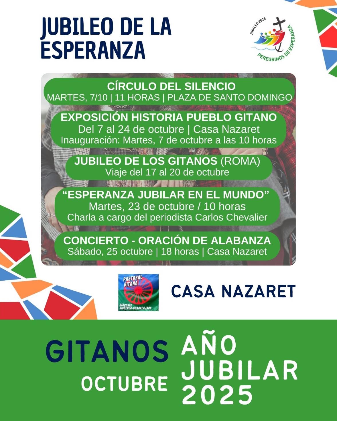 Este 2025 se cumple el 600 aniversario de la presencia documentada del pueblo gitano en la Península Ibérica y es por ello que este Año Jubilar de la Esperanza no deja pasar por alto esta efeméride. Así, a lo largo del mes de octubre, desde Casa Nazaret, como lugar jubilar que es de la Diócesis Sigüenza-Guadalajara, hace referencia al Pueblo Gitano como signo vivo gracias a su historia, sufrimientos, esperanza y contribuciones que pueden hablar, interpelar y enriquecer a la Iglesia y a la sociedad en este tiempo jubilar.