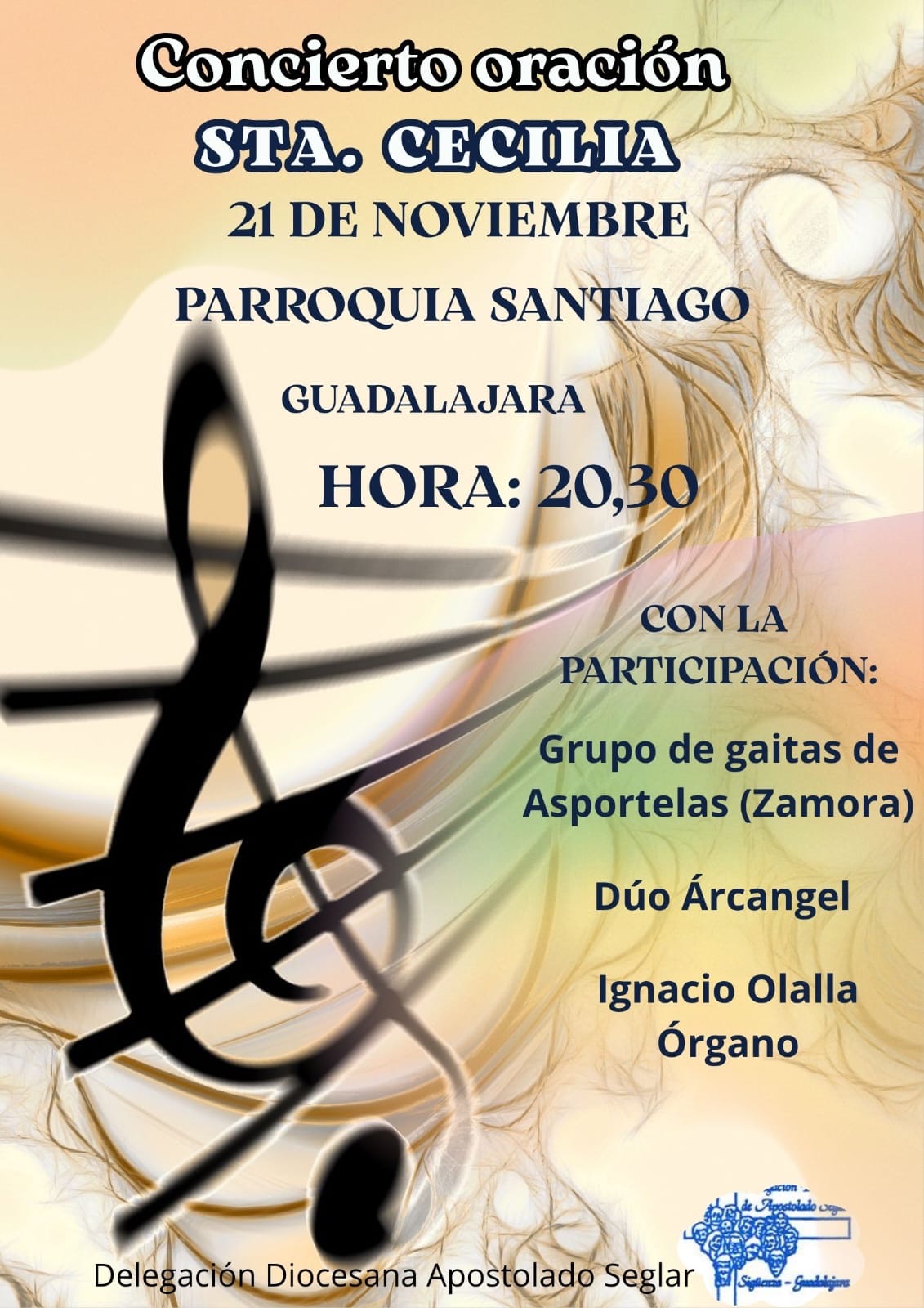 Ya es tradicional la cita musical enn honor de santa Cecilia que organiza la Delegación de Apostolado Seglar y Nueva Evangelización en el templo de Santiago Apóstol de Guadalajara. También este año con el formato de concierto-oración, será a las 20:30 horas del viernes 21. Lo protagonizarán el Grupo de Gaitas As Portelas de Zamora, el Dúo Arcángel y, al órgano, Ignacio Olalla.