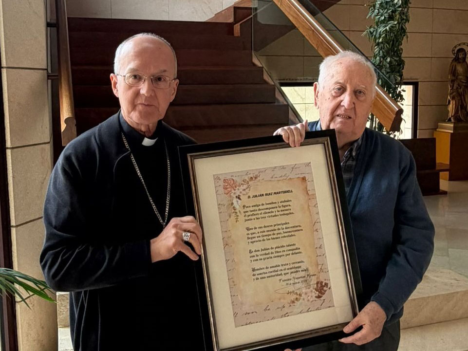 Don Julián Ruiz Martorell, el obispo diocesano, ha recibido un soneto del sacerdote y escritor Francisco Vaquerizo Moreno (1936) como regalo de cumpleaños en su 69 aniversario. El autor ha entregado personalmente al prelado un vistoso cuadro con la reproducción del poema. Bajo el título Don Julián Ruiz Martorell, la composición canta una docena de rasgos que el poeta descubre en el homenajeado. El soneto, de traza académica e inspiración clásica, se encuadra dentro de la amplia colección de obras homenaje que ha escrito el poeta.