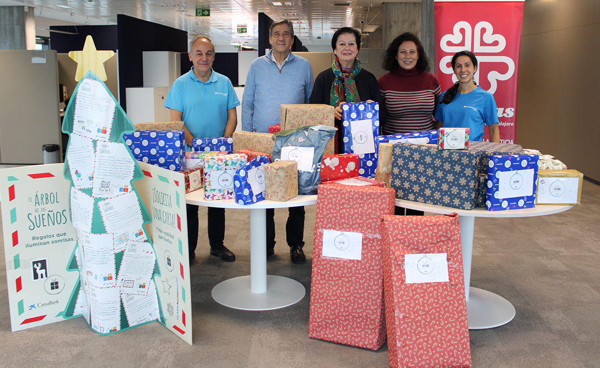 Un total de 36 niños y niñas que disfrutan de los recursos de Cáritas Diocesana Sigüenza-Guadalajara han participado en “El Árbol de los Sueños” de la Fundación La Caixa, iniciativa que colabora con los Reyes Magos a llevar un juguete a las casas de estos pequeños. Los niños y niñas participantes forman parte de Proyecto Integral y del Centro Belén. El convenio entre Cáritas Diocesana y la Fundación La Caixa encauzó la iniciativa que los voluntarios de ambas entidades concretaron entregando los juguetes tuvo lugar en la sede de la enttidad bancaria en Guadalajara. En el acto participaron, junto con voluntarios de la Fundación, la directora de Cáritas Diocesana, María José Bustos, el secretario general, Julio César Gómez, y la coordinadora de Desarrollo Institucional, Verónica Renales.